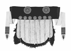 剪裁時(shí),將羊皮修剪成U型,上部橫鑲一段黑氆氌(毛織品)或黑呢子,內(nèi)襯天藍(lán)色棉布。其下用七對(duì)白色鹿皮條穗縫綴并列的七個(gè)小圓形彩線繡花布盤(pán),肩部縫綴兩個(gè)大圓形彩線繡花布盤(pán)。羊皮上端縫釘兩條繡花白布長(zhǎng)帶,帶端還繡有花鳥(niǎo)、魚(yú)蟲(chóng)、動(dòng)物、植物、幾何等圖案,據(jù)說(shuō)是象征納西族人民如蜂似蝶地奔忙,以辛勤勞動(dòng)換取甜蜜生活。