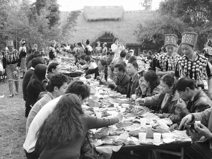 游客正在欣然品嘗景頗傳統(tǒng)飲食“綠葉宴”