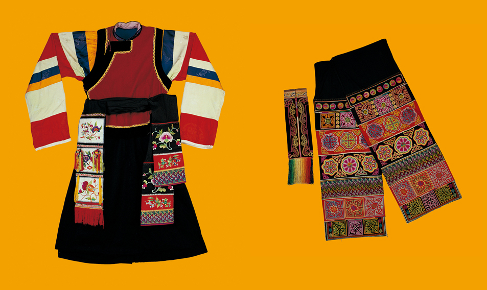 圖為青海互助土族彩袖女服與牡丹紋布腰帶,中央民族大學(xué)民族博物館館藏