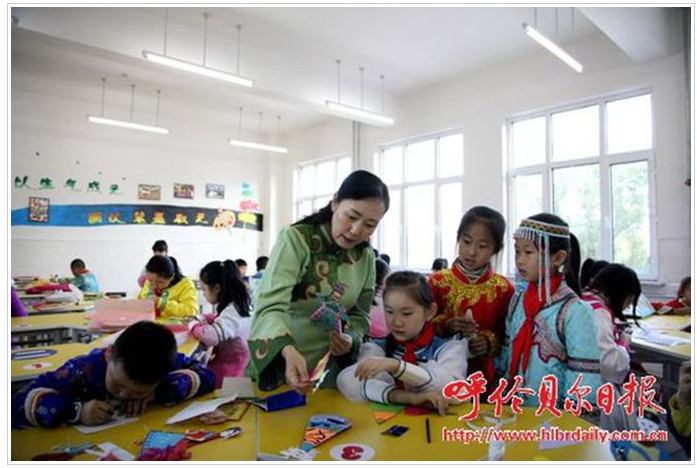 蘇梅在莫旗民族實(shí)驗(yàn)小學(xué),指導(dǎo)孩子們制作達(dá)斡爾族玩偶哈尼卡