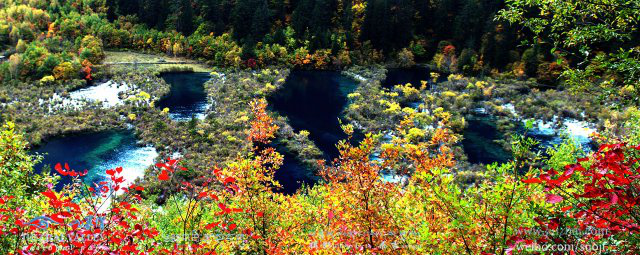 九寨溝四周群山聳峙,有雪峰數(shù)十座,高插云霄,終年白雪皚皚。河谷地帶奇水薈萃,其間有成梯形分布的大小湖泊114個(gè),瀑布群17個(gè),鈣華灘流5處,泉水47眼,湍流11段,以1870米的海撥高差,在12 座雪峰之間穿林跨谷,珠連玉接,呈Y字型串珠,逶迤近60公里,形成了中國(guó)唯一、世界罕見(jiàn)的以高山湖泊群和瀑布群以及鈣華灘流為主體的風(fēng)景名勝區(qū)。湖泊小者數(shù)平方米,最大的長(zhǎng)海長(zhǎng)達(dá)7公里。湖水終年碧藍(lán)澄澈,色彩斑讕,在陽(yáng)光照射下,呈現(xiàn)出藍(lán)、黃、橙、綠等多種色彩,絢麗奪目。天氣晴朗時(shí),藍(lán)天、白云、雪山、森林倒映湖中,水光浮翠,美麗如畫,并隨季節(jié)推移呈現(xiàn)出不同的色彩和風(fēng)韻,有“九寨歸來(lái)不看水”之說(shuō)。