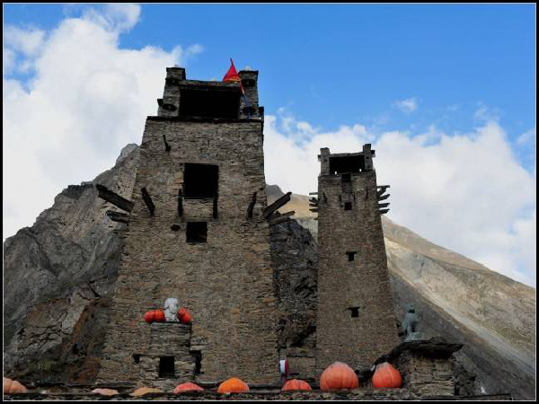 在羌語中,碉樓被稱為“邛籠”,意為美麗、高貴的房子,早在2000年前《后漢書·西南夷傳》就有羌族人“依山居止,壘石為屋,高者至十余丈”的記載。碉樓的高度在十米至三十米之間,用于御敵、貯存糧食和柴草。碉樓有四角、六角、八角幾形式,有的高達十三四層。建筑材料是石片和黃泥土,墻基深1.35米,以石片砌成。石墻內(nèi)側(cè)與地面垂直,外側(cè)由下而上向內(nèi)稍傾斜。修建時不繪圖、吊線、柱架支撐,全憑高超的技藝與經(jīng)驗。建筑穩(wěn)固牢靠,經(jīng)久不衰。自唐朝來,羌族人民因各種原因向西北遷移,到了西藏和青海,所以現(xiàn)在,羌族碉樓也往往被稱為藏族碉樓。