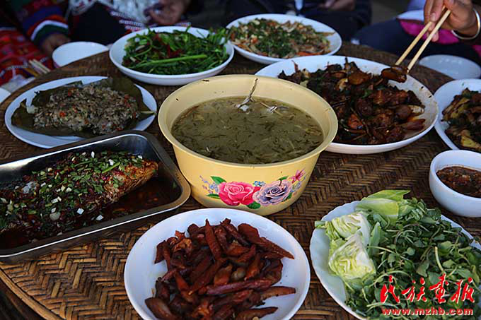 在曼夕村,民族傳統(tǒng)節(jié)日已成為不同民族間聯(lián)絡(luò)增進(jìn)感情的最佳時(shí)機(jī)。曼夕村村主任車達(dá)告訴記者,他自己是哈尼族,村里還有漢、布朗、哈尼等民族。40多年前,為了種植橡膠樹布朗族與彝族遷徙過來生活在一起,幾十年來,兩個(gè)民族相互尊重對(duì)方的生活習(xí)慣,過年過節(jié)相互走動(dòng)拜訪,互相通婚成為一家人。晚飯時(shí),記者在曼夕村村支書巖坎硝家里聚餐時(shí)看到車達(dá)帶著幾個(gè)哈尼族婦女盛裝出席,宴會(huì)上人們相互祝賀,唱敬酒歌。哈尼族婦女圖處告訴記者,哈尼族過傳統(tǒng)節(jié)日,布朗族村民要來慶賀,布朗族過節(jié),哈尼族人也去祝福,幾十年來一直如此。