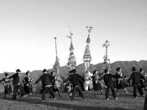 登窩羅時(shí),領(lǐng)唱的人在前,這人叫“稍干”。其他人雙手叉腰,跟著稍干唱。邊唱邊大蹲大跳,一會(huì)兒背對(duì)背,一會(huì)兒面對(duì)面。春節(jié)圍著窩羅牌坊跳,平時(shí)圍著一張擺滿(mǎn)煙酒茶果的桌子跳,意思是圍著太陽(yáng)、月亮轉(zhuǎn)。