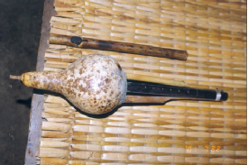 阿昌族的樂器主要有竹琴、洞簫、葫蘆簫(右圖,劉軍攝)、三月簫、銅口弦、三弦、象腳鼓(下圖,蒙哥提供)、铓鑼等。葫蘆簫是用葫蘆連接三根竹管制成的,它有7個(gè)音,音量小,音調(diào)低緩圓潤,一般晚上用。三月簫用一根竹管制成,也有7個(gè)音,它的音量大,音色細(xì)亮,多在白天使用。葫蘆簫和三月簫不僅是阿昌族人民心愛的傳統(tǒng)樂器,還是男女青年傳情示愛的媒介。