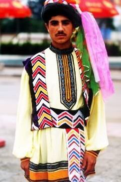 塔吉克族男子衣飾,白色襯衣外,穿一款青色或藍(lán)色的無領(lǐng)對襟“袷袢”長大衣,腰系三角腰巾,腰巾繡花,右側(cè)掛一把小刀。體魄健壯的塔吉克青年與老人,常穿皮裝,封襟、交領(lǐng)、袖長過手指、衣長過膝的外衣,寬松得體;無扣,不開叉,用腰帶一束,緊身舒適。寒冬中披光皮大衣,穿皮長褲,戴羊羔皮帽。夏季,也穿皮裝或絮駝毛棉大衣,戴白色翻毛皮帽,腳穿長筒皮靴,輕巧、柔軟、結(jié)實(shí)耐磨,以適應(yīng)高山多變的氣候。