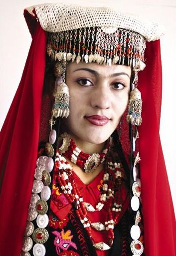 塔吉克族女子愛戴首飾,最引人注目的要數(shù)新郎和新娘的裝束了。新娘的“庫勒塔”帽,前綴一排銀色小鏈子,戴長長的耳環(huán),頸部戴幾排碩大的項(xiàng)鏈。辮子上飾流蘇或白扣、銀元,手有手鐲、戒指。新娘頭上是一條長長的紅色或黃色頭巾,外穿紅色長大衣,系紅白相間的手帕。