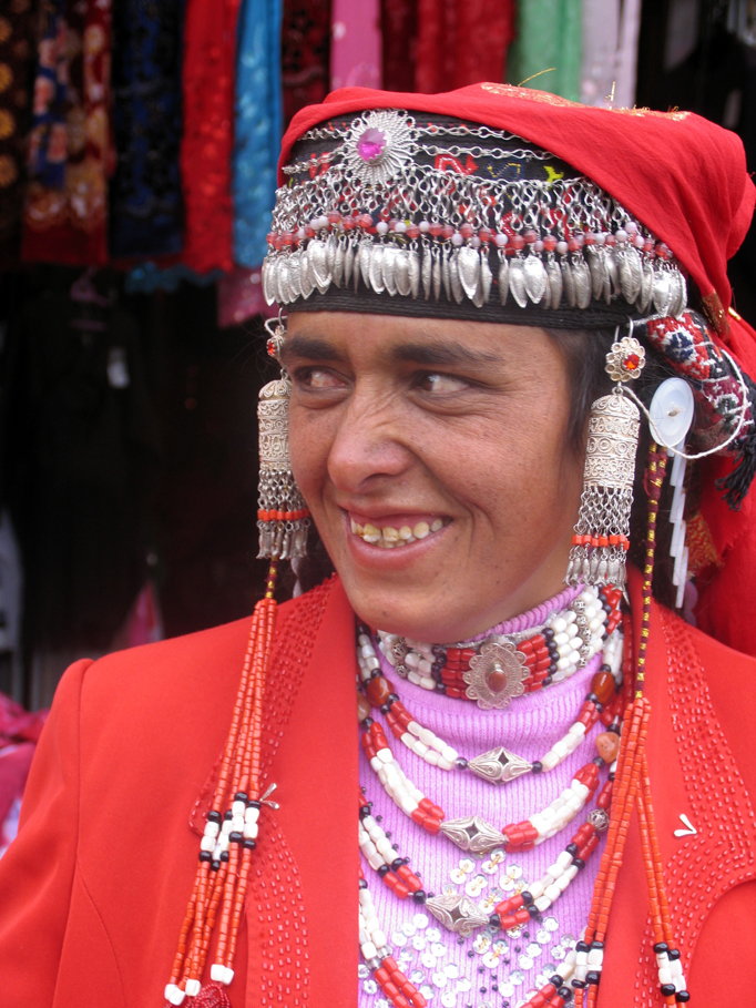 塔吉克族婦女服飾的顏色艷麗而奪目,大多數(shù)會(huì)以紅色為主,她們喜歡穿連衣裙,并在裙邊、領(lǐng)口、袖口上繡以美麗的花紋或者圖案,還喜歡用耳環(huán)、項(xiàng)鏈、手鐲等首飾來裝扮自己。她們十分講究頭飾和帽子,有一種青年婦女的圓形花帽上會(huì)嵌鑲金、銀片和各種珠子,帽子前沿會(huì)裝飾一排色彩鮮麗的珠子、銀鏈。婦女著裝時(shí)帽沿上會(huì)加綴一排小銀鏈,在塔吉克語中稱為“斯拉斯拉”,戴著大耳環(huán),脖子山會(huì)繞數(shù)道項(xiàng)鏈,胸前還會(huì)佩戴被稱為“阿勒卡”的圓形大頭飾。通常情況下,已婚婦女會(huì)在發(fā)辮上綴飾白紐扣,新娘也會(huì)在發(fā)辮上飾以絲穗,以求美觀。在塔什庫爾干,打扮得花枝招展的塔吉克婦女隨處可見,猶如從天上云彩中下凡的仙女。塔吉克族已婚婦女的裝束也十分吸人眼球,她們外出時(shí),會(huì)在帽子外披上頭巾,迎風(fēng)走來,頭巾隨風(fēng)飄揚(yáng),別有一番風(fēng)度。