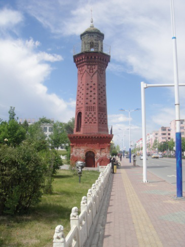 雙塔,距紅樓不遠,是于19世紀末和20世紀初兩名烏孜別克族商人捐建的“宣禮塔”。雙塔呈鐵紅色,造型峻拔,塔身上的磚雕,菱形、圓形、六角星圖案美感別具風(fēng)味,圓形琉璃的塔頂,亮如翡翠,通過塔座上的小木門可登上塔頂。這座雙塔體現(xiàn)了典型的俄羅斯建筑風(fēng)格。