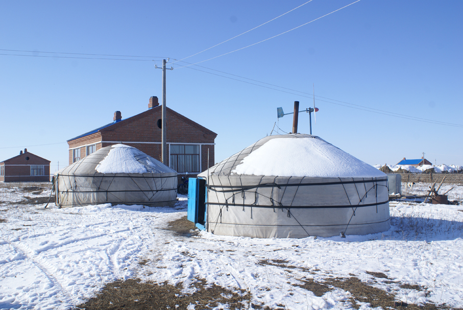牧區(qū)主要的住房是“蒙古包”,鄂溫克人稱住房為“糾”,分別有“奧布海糾”和“俄儒格糾”。前者是一種形式簡陋的蒙古包式的住房,一般為打獵、拉腳、打羊草時的臨時住房,或為經(jīng)濟(jì)困難人家迫不得已時所居住。建造“奧布海糾”需要二三十根榆木桿子,頂端用繩子結(jié)在一起,下端插進(jìn)地里形成“糾”的架,用葦子搭蓋出呈傘狀的棚房。這種房早期沒有定形的門,一般向南開一小口出入,僅以葦捆及氈子作門。后來“奧布?!币惭b置頂孔,材料是榆木和柳木,鑿出現(xiàn)代蒙古包的包頂。圓頂?shù)倪吘壣香@有小孔,以便插進(jìn)木桿,成錐形。同時用葦子搭蓋成屋,冬季門里掛上一層氈子防寒?!岸砣甯窦m”也就是現(xiàn)在所稱的“蒙古包”,因為圓孔屋頂而得名。蒙古包的木架是用上、中、下三節(jié)結(jié)構(gòu)組成而成,外面的擋簾根據(jù)季節(jié)不同而樣式不同,夏季采用柳條串成簾圍在包外,用蘆葦串成傘形簾,蓋在上面擋雨。冬季則用帆布外加氈子圍嚴(yán),以保包內(nèi)溫度,近年冬季在包內(nèi)床下搭熱炕。蒙古包一般選在陽坡、地勢較高、用水方便、靠近牧場的地方搭蓋。在搭蓋蒙古包時,雨季要搭得斜度大些,以防漏雨;冬季為免受強(qiáng)風(fēng)吹襲,則搭建的斜度小。蒙古包內(nèi)置有床、爐子,有木箱柜、桌子等用具。近年來,隨著經(jīng)濟(jì)的發(fā)展,住土房、磚房的越來越多。值得一提的是鄂溫克族的牧民雖無固定住所,卻有固定建筑,那就是他們的倉庫。鄂溫克族的倉庫極為奇特:先砍去相鄰兩棵大樹的樹梢,作為柱子,然后用木頭壘出一間懸空的倉庫,地上斜豎一根砍有階梯的木柱為梯。倉庫中存放食品、獵物、衣服、用具等。牧民從不上鎖,其他獵人可任意取用,事后如數(shù)歸還即可。