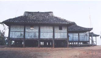 比較典型而普遍的是以德宏地區(qū)一戶(hù)一院式的正方形冠蓋式竹樓。構(gòu)架為穿斗式木梁柱,樓面、隔間均用竹片或木板鋪設(shè)。這種竹樓分主樓和附房?jī)刹糠帧I舷聝蓪?,有主副兩座樓梯。主樓呈正方形,樓上住人,分為臥室和客廳,供全家人起居、會(huì)客和存放糧食、雜物之用;樓下圈養(yǎng)牲畜。附房多建在主樓的一側(cè),用作堆放柴草及安置舂米的腳碓。