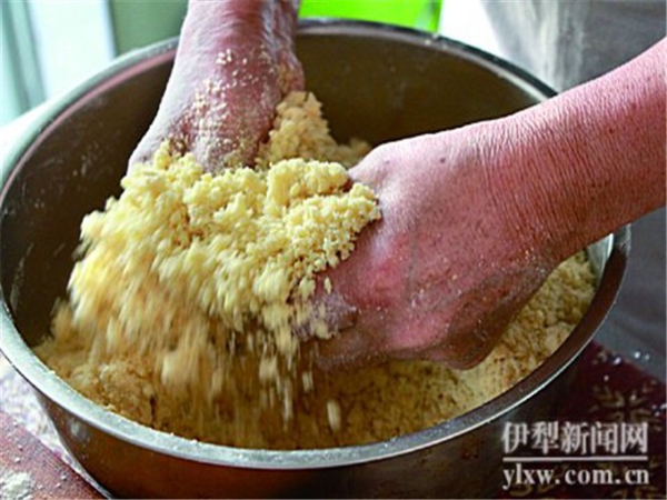 待面成為不黏手的細(xì)小顆粒,方能揉團(tuán)