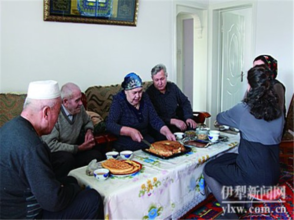 整個(gè)制作過程,兩個(gè)老人有一搭沒一搭地聊著天,準(zhǔn)備食材,互相搭把著手。屋外客廳里,她們的丈夫一邊看著電視一邊等,其樂融融,倒讓人感覺到一種歲月靜好的美感。待屋子里到處都飄蕩著拜列西濃烈誘人的香味時(shí),大家的味蕾都被調(diào)動(dòng)起來。就在這當(dāng)兒,買斯胡旦的弟弟帶著弟媳也來了。兩口子熱鬧,一開門,爽朗的笑聲就飄進(jìn)門。弟媳說:“嗨,我這兩個(gè)姐姐手可是巧得很!”弟弟說:“做了這么好吃的東西,沒人來吃怎么能成!”