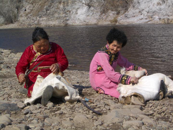 鄂倫春人過去在家庭公社“烏力鄰”里,同生產(chǎn)共消費(fèi),在當(dāng)時(shí)生產(chǎn)力十分低下的情況下,憑著扎槍和弓箭,單個(gè)人很難獲得能夠滿足衣食需要的獵物,必須要有“烏力鄰”全體成員的通力合作,才能戰(zhàn)勝兇猛和龐大的野獸,所以,在“塔坦達(dá)”領(lǐng)導(dǎo)下的集體狩獵是當(dāng)時(shí)最主要的勞動(dòng)形式。隨著生產(chǎn)力的不斷發(fā)展和個(gè)體小家庭的大量流動(dòng),不僅社會(huì)組織“烏力鄰”由原來血緣性的家庭公社演變?yōu)榈鼐壭缘牡赜蚬?,勞?dòng)組織也隨之發(fā)生了極大的變化。集體狩獵已不再是“烏力鄰”傾巢出動(dòng),而是由幾個(gè)小家庭的成員自愿結(jié)合成“安嘎”來進(jìn)行。同時(shí)還出現(xiàn)了集體和個(gè)人等多種勞動(dòng)形式。狩獵也不再單純是為了滿足衣食的需要,剩余獵物可以拿去交換,獵產(chǎn)品已趨于商品化。故此時(shí)一些珍貴的細(xì)毛皮張和藥用價(jià)值較高的獸類,成了鄂倫春人主要的狩獵目標(biāo)。這樣就形成了一年中的四個(gè)狩獵旺季,即:農(nóng)歷正月至2月是“鹿胎期”;4月至6月是“鹿茸期”;9月至落雪為“叫鹿尾期”;落雪后至來年開春是“打皮子期”。大概是源于原始的圍獵,鄂倫春人把狩獵叫“打圍”,而這四個(gè)狩獵旺季就叫“紅圍期”?!凹t圍期”除“叫鹿尾期”外,都組織“安嘎”集體出獵?!鞍哺隆笔且环N臨時(shí)性的狩獵組織,狩獵旺季將臨時(shí),由一人發(fā)起,串聯(lián)幾位親朋好友或志趣相投的人組成一個(gè)“安嘎”,待獵期結(jié)束,“安嘎”自行解散,下次出獵時(shí)再重新組合,因此其成員并不是固定的(圖為熟化狍皮,吳雅芝攝影)。
