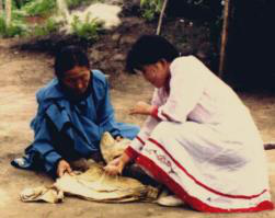 圖八 圖九 赫哲族婦女用木鍘刀熟魚(yú)皮 將熟好的魚(yú)皮連成大片
