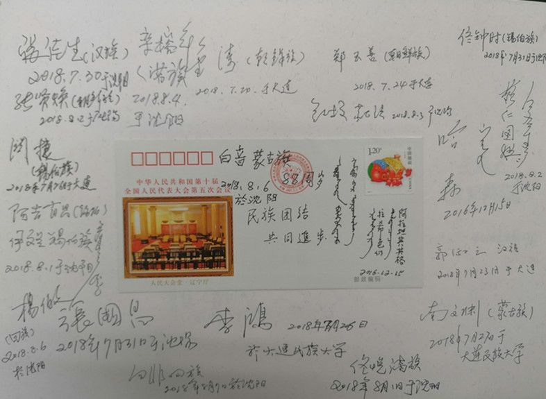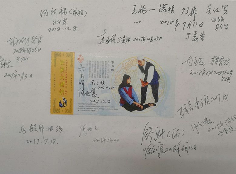 在采集口述影像錄音資料的同時,項(xiàng)目組還收集了大量的珍貴歷史照片以及相關(guān)文物。值得一提的是,他們設(shè)計了一種非常有特色的受訪者簽名簿,中間貼著繪有56個民族的音樂舞蹈圖案的首日封或明信片,四周簽上受訪者的人名簽名字、民族特征,有些還用民族文字書寫,體現(xiàn)了中華各民族團(tuán)結(jié)在一起的精神風(fēng)貌。簽名簿有厚厚的幾大本,設(shè)計精美,承載著民族工作口述史資源采集的經(jīng)歷,具有豐富的文化內(nèi)涵和博物館收藏價值。
