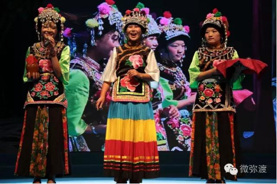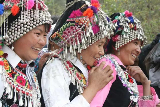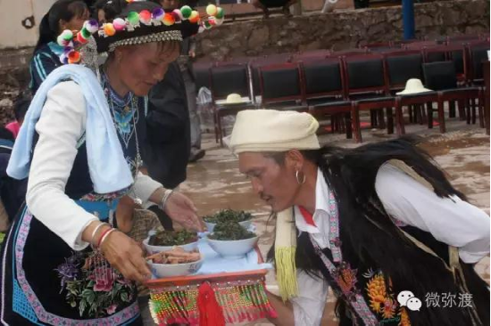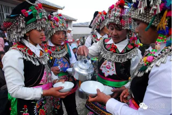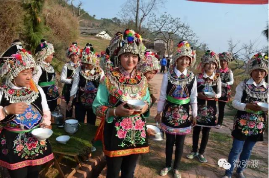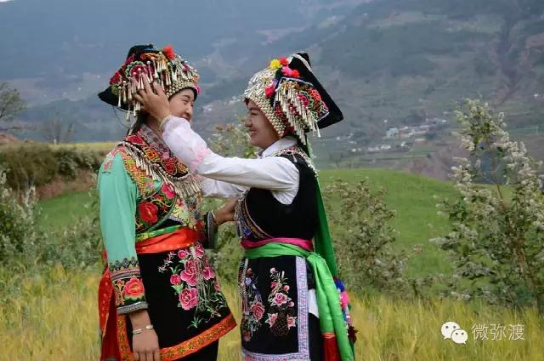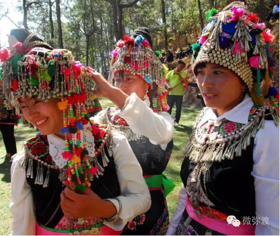 “羅羅潑支”男女服飾的特點:“羅羅潑”男子服飾與“迷撒潑”相差無幾,一般不戴白頭巾。但是婦女的服飾相差卻很大,明顯保留著古樸高雅的南詔遺風。頭飾由桂花、包頭、飄帶、大墜子、蜜蜂墜、芝麻鈴組成。桂花墊子在裱布上蒙黑色面料,中間訂有銀飾。包頭以黑色為主,長約2米,后鏈系于包頭,鏈子為銀制。飄帶長約4尺,黑色留花邊,兩頭訂英蘇。包頭還系有大墜子、蜜蜂墜各一對,芝麻鈴20個。領合由裱布黑色面料上訂芝麻玲20個圍在脖子上。圍腰的前胸部,由領口至腹部,左右各垂掛一條綴有串珠、針筒、響篾(口弦)一類飾品和生活用品的銀質(zhì)項鏈。人一走動,全身的小蘇鈴就響,聲音悅耳動聽,形象美觀大方。額頭前還圍有一塊翠綠色的“桂花綁”,綁上釘有銀質(zhì)小泡泡200多顆,羅羅潑支婦女的服飾彰顯華麗之美。