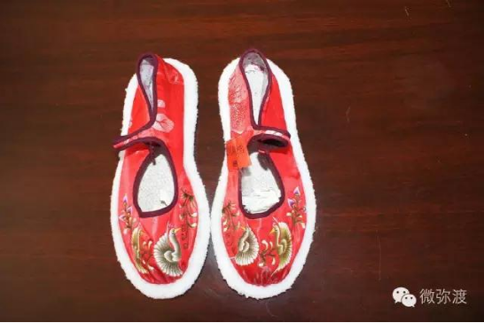 繡花鞋分大口鞋、小口鞋兩種。大口鞋大方素雅,小口鞋古樸艷麗。花樣有“峰趕梅”、“喜鵲登枝”、“獅子滾雪球“、“鳳穿牡丹”和彝族人民結婚時候,按當?shù)仫L俗所需必須穿的“毛邊底”等。這些花樣圖案具有不為時代變幻所動的恒久性質(zhì),蘊藏著濃厚的傳統(tǒng)民俗文化。它給予人們的絕不僅僅是絢麗悅目的美感,還是彝民們征服自然,繁衍生息,爭取愛情和歡樂的記錄。