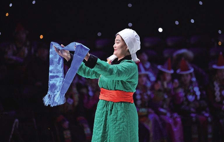 內(nèi)蒙古藝術(shù)學(xué)院的學(xué)生在舞臺上展示蒙古族禮服。
