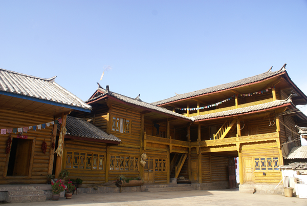 普米族的村落一般建在有松林的半山緩坡地帶,通常二三十戶為一村,村寨之間距離很近,可以炊煙相望,雞犬相聞。住房多為木結(jié)構(gòu),墻壁用直徑12厘米左右圓木重疊垛成,木板鋪成人字形雙斜面屋頂,屋頂木板可拉動的兩塊又稱“滑板”,四角豎圓柱,中央立一根大方柱,叫“擎天柱”,認為是神靈所在的地方。這種住宅當?shù)厮追Q“木楞房”或“木壘子”。