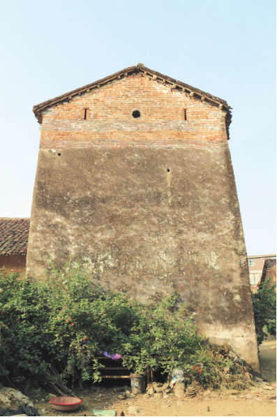 坡樂莫氏碉樓位于忻城縣思練鎮(zhèn)練江村玻樂屯東 17號(hào),雕樓懸山式,共 3層,座北向南,寬 4.3米,進(jìn)深 6米,高 9米,第一層為片石砌成,第二層用粘土夯成,第三層為青磚清水墻,第一和第二層用石灰沙漿抹面,墻厚 60厘米。