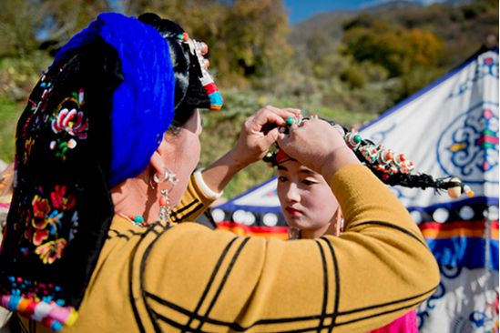 盤好發(fā)髻,佩戴好頭飾,在肩、背系好五彩哈達(dá)后,由本村具有威望的女性長者引領(lǐng)來到儀式現(xiàn)場。法號聲中,煨桑的青煙裊裊升起,威嚴(yán)的活佛主持誦經(jīng)祈福儀式。隨后,德高望重的長者為參加儀式的女子送祝福茶,長輩為姑娘們獻(xiàn)哈達(dá)。一系列儀式結(jié)束后,無論男女老少,都來到場地中央,踏歌起舞,跳起吉祥的鍋莊。
