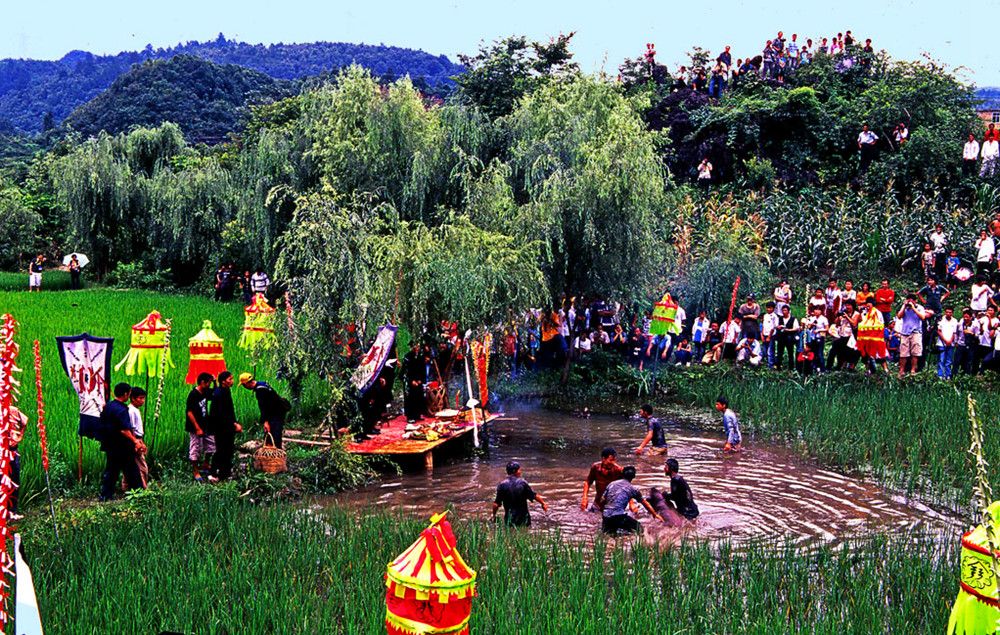 敬霞儀式在霞堂舉行。霞堂設(shè)有祭壇。壇前立著一根竹竿,竿頂上站立一只公雞。祭壇中是主祭席,其友有用松針?shù)伋墒€(gè)祭祀點(diǎn),由宗族各支系擺設(shè)祭品。敬霞這天,各支系由德高望眾者領(lǐng)隊(duì)。抬著豬肉、糯米飯、米酒等食品列隊(duì)進(jìn)入霞堂。一路上銅鼓、銅鑼、欽、革鼓被敲得冬嚏冬嚓地響,人們跟在后面吆喝著前進(jìn)。祭典開(kāi)始,鑼鼓暄天。接著由執(zhí)壇的水書(shū)先生念讀敬霞的祝詞,內(nèi)容多為祈福禳災(zāi),期冀風(fēng)調(diào)雨順,人壽年豐之類(lèi)。祝詞之后便酪酒祭之:此后,由兩個(gè)身穿白衣的小伙子抬一母豬到田壩中繞行,后面那位不時(shí)用松針刺戳豬的尾部,使它發(fā)出嗥叫聲。圍觀的人常常發(fā)出哄笑,并且盡情地用竹片屏水和撮稀泥向抬豬者灑淋過(guò)去。走過(guò)霞堂之后,抬豬者丟下母豬,故意穿進(jìn)圍觀的人群,嚇得人們四處躲避。這種逗趣結(jié)束之后,水書(shū)先生再度念讀咒詞,當(dāng)他手中的執(zhí)法彩杖一揮時(shí),飼雞者便學(xué)雞嗚,逗引竹竿頂上的公雞啼鳴。這時(shí),主祭者就向眾人高呼:等待霞神降雨來(lái)沐浴。此后,水書(shū)先生再念祝詞,又酹酒祭之。然后由各族系代表抬著"酒壇去澆灌"霞神"。人們用酒從頭澆到腳,一直澆到"霞神"們倒(象征酒醉)才算祭祀的成功。