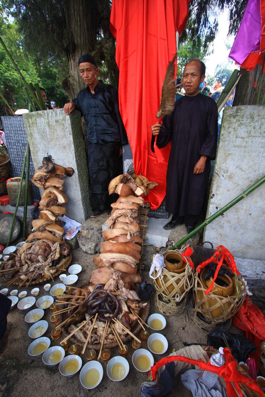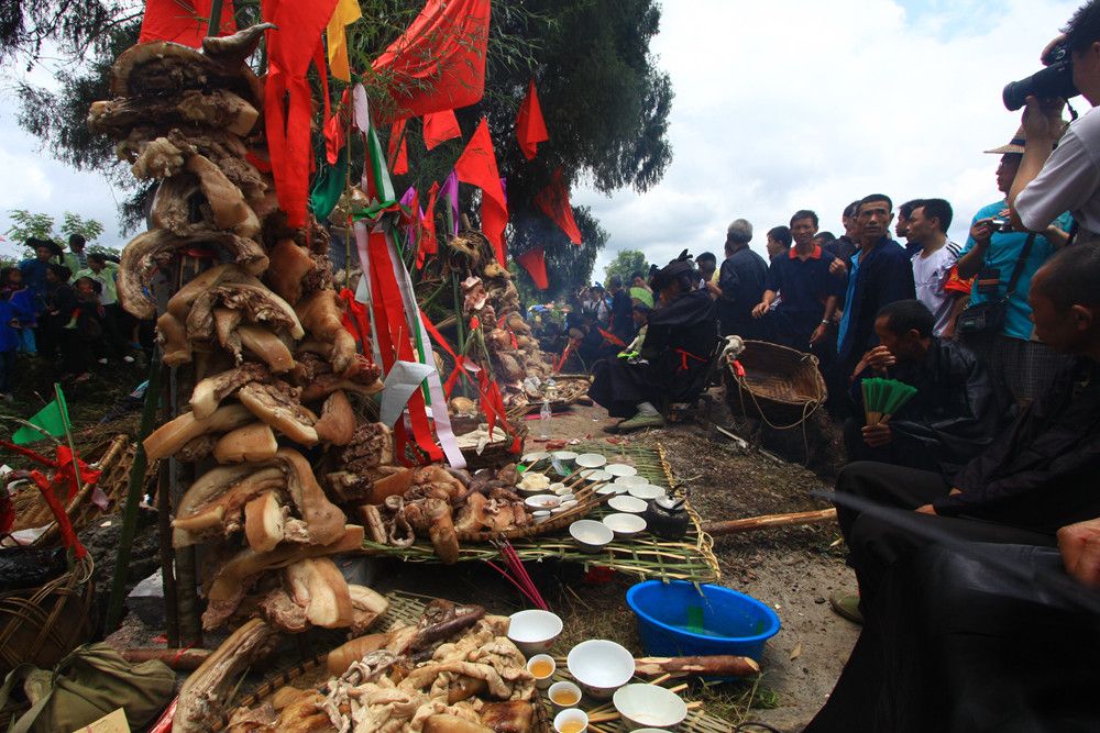 人們傳說(shuō)只有醉倒了"霞神",它才能永遠(yuǎn)留在這方,才能使這里風(fēng)調(diào)雨順。當(dāng)水書(shū)先生念了最后的咒詞,祭典才在鼓樂(lè)聲和歡呼聲中結(jié)束。最后,各族系將祭肉一并聚攏,聚餐慶祝。天黑之后,人們秘密地將"霞神"收藏起來(lái),至此,"敬霞"活動(dòng)全部結(jié)束。