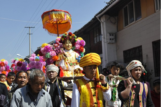 農(nóng)歷二月初六,迎太子入城。這一天在佛教徒的帶領(lǐng)下,人們焚香沐浴,衣冠整齊,虔誠(chéng)地將“太子”(用布扎油漆制成的太子行像)請(qǐng)到行宮或本主廟里。這一年的新郎為太子抬轎,希望能得到太子的保佑而使新婚的妻子孕生男兒。