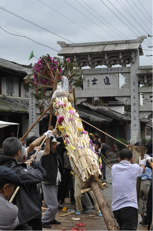 到了這一天,親友鄰居都不請(qǐng)自到來(lái)幫忙和祝賀。綁扎柴禾,做小彩旗,栓水果串等,等一切都好,再齊心合力豎起火把。等掛著果串的斗升一點(diǎn)點(diǎn)離開(kāi)地面,火把樹(shù)穩(wěn)穩(wěn)當(dāng)當(dāng)挺立的時(shí)候,孩子的奶奶和外婆就在火把樹(shù)下燃起香,敬上茶酒和米干,虔誠(chéng)地磕頭祈禱。