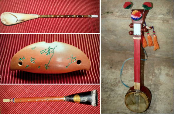 彝族特色樂(lè)器:補(bǔ)熱、阿烏和牛角小篳篥;右為彝族三弦