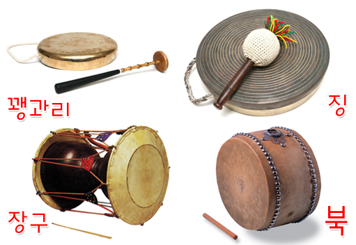 “四物樂”,朝鮮語為????。四物樂是由韓國著名民俗家沈雨晟先生命名的,20世紀90年代傳入我國吉林延邊朝鮮族自治州。“四物樂”由小鑼(???)、鑼(?)、長鼓(??)、圓鼓(?)四種樂器演奏音樂,并且由此音樂來做游戲。每種樂器都是以大自然的聲音來形成的。小鑼象征風,長鼓象征雨,圓鼓象征雷,鑼象征電。