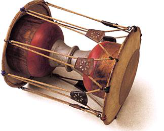 鼓框為木質,兩面蒙皮,用繩索固定在木框兩邊。鼓鏈木質,通常在表演中負責敲擊主要旋律的重拍,也有獨奏的情況,聲音有力。