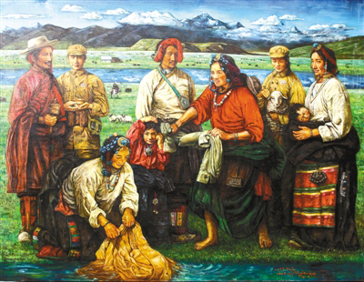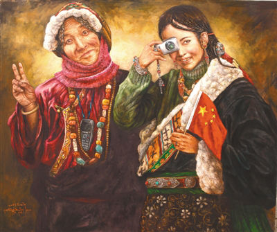 “以前畫畫時(shí),對(duì)自己的最高要求就是畫得要逼真,把油畫畫得像一幅放大了的照片,而現(xiàn)在關(guān)注的是如何畫出能體現(xiàn)當(dāng)代的畫面。西藏的美是無(wú)窮無(wú)盡的,我就想用繪畫的方式窮盡一生去追求,展現(xiàn)大美西藏。”如今的索曼尼,淡去了初出茅廬時(shí)一味追求畫面質(zhì)感的匠氣,多了些許內(nèi)心對(duì)西藏這片熱土深層次的思考。他筆下的西藏是一片充滿生機(jī)的土地,濃墨重彩之間,既有對(duì)傳統(tǒng)和過(guò)往年華的回望和懷念,又在仿若不經(jīng)意間透過(guò)一個(gè)眼神、一抹色彩、一個(gè)小物件盡情詮釋活力和希望。