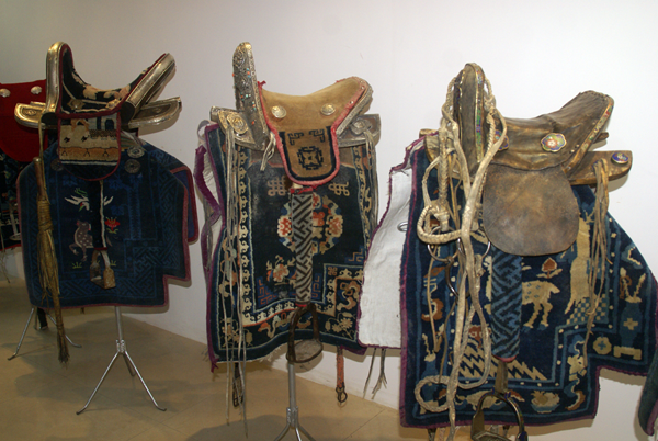 裝飾弓、矛、劍、盾、箭筒,尤其馬鞍,是蒙古族牧民的一貫愛好。大汗的坐椅是包金的,龍頭虎狀,鞍馬帶上亦以黃金盤龍為飾。鞍鞒喜歡配有各種裝飾,有的繪制圖案,有的用骨雕鑲嵌,有的鑲嵌金屬工藝制品。蒙古人更喜歡銅壺、銀碗、金杯等飲食器具。