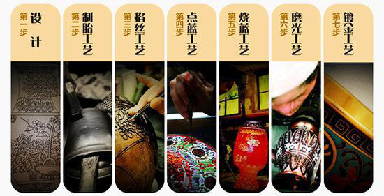 一件景泰藍成品需要歷經(jīng)設(shè)計、制胎、掐絲、點藍、燒藍、磨光、鍍金七大步驟,近百道工序,十幾個工匠三個月的時間純手工方能完成。景泰藍既運用了青銅工藝,又吸收了瓷器工藝,同時大量引進傳統(tǒng)繪畫和雕刻技藝,是集冶金、鑄造、繪畫、窯業(yè)、雕、鏨、錘等多種工藝為一體的復合性工藝過程,堪稱集中國傳統(tǒng)工藝之大成,因而自古便有“一件景泰藍,十箱官窯器”之說。