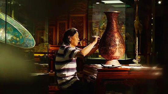 “寶瓶如花放光彩,全憑巧手把花栽,不得白芨花不開,不經(jīng)八卦蝶難來,不受水浸石磨苦,哪能留得春常在?!薄@首民謠惟妙惟肖地唱出了景泰藍制作過程的繁復與艱深。