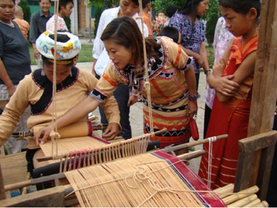 2010年上海世博會(huì)活動(dòng)周期間,一臺名為《記憶云南》的18項(xiàng)非物質(zhì)文化遺產(chǎn)展示成為最吸引眼球的亮點(diǎn)之一?;顒?dòng)現(xiàn)場,18名云南非物質(zhì)文化遺產(chǎn)傳承人和民間藝人展示白族布扎、納西族東巴畫、傣族剪紙、傣族竹編、佤族織錦技藝等制作技藝。其間展示的佤族織錦技藝在民族文化風(fēng)情濃郁,文化底蘊(yùn)深厚的耿馬縣佤族村寨里流傳甚廣。在耿馬的佤族村寨里,婦女們一般都會(huì)紡線織布,佤族傳統(tǒng)服飾也多用自染自織的土布縫制。此地佤族傳統(tǒng)服飾按地域分為兩大類。一類是分布在耿馬鎮(zhèn)、四排山鄉(xiāng)的傳統(tǒng)服飾,以女性身著佤族紅色短衣筒裙、男子身著佤族黑衣寬褲為標(biāo)志;一類是分布在勐簡鄉(xiāng)大寨村的“黃衣阿佤”服飾,以女性身著佤族黃衣筒裙、男子身著黃衣寬褲為標(biāo)志。佤族婦女所用的紡線有棉線、麻線兩種。棉主要是草棉,麻主要為苧麻和野生火麻,紡線采用內(nèi)地傳入的有紡錘的紡車。在耿馬鎮(zhèn)芒國村芒俄村民小組等佤族聚居村寨,筆者先后目睹了佤族織錦的全過程。只見紡織 中的佤族婦女一個(gè)個(gè)端坐在紡車前,凝神專注地操持著手中的活計(jì)。她們左手持麻,右手持紡錘,將紡錘放在大腿上一搓,紡錘轉(zhuǎn)動(dòng)起來后,把麻纖維慢慢從左手拉出并捻成線,紡好一截線便將它繞到小竹棍上。如此這般不停地左右穿梭,又不斷地再搓、再捻,紡出的布匹紋理細(xì)密、結(jié)實(shí)挺拔。耿馬四排山鄉(xiāng)織錦的佤族婦女,大多采用一套竹木制的很原始的腰機(jī),前后上下共有十七個(gè)零件。紡線時(shí),她們將線的一頭栓在婦女腰上,另一頭用木棍穿好,擱在織布處釘在地上的兩根木樁上。織時(shí)兩頭繃緊,將繞在木棍上的緯線穿到經(jīng)線的中間,然后用抒刀把線打緊。這種織法節(jié)奏雖然慢一些,但織出的布更加厚實(shí)緊繃,適用于紡織粗布和麻袋。在勐簡鄉(xiāng)大寨村的穿“黃衣”的佤族婦女,用黃土、玉米粉、茶葉、小飯豆、欖樹皮等7種植物做原料浸染的黃色棉線織錦,使用的有竹木制腰機(jī)和紡錘紡車兩種。織錦時(shí),只見她們一邊捻線,一邊傳遞紡錘。不織時(shí),又把紡錘和抒刀拆下,依然卷起放好。來自耿馬鎮(zhèn)、四排山鄉(xiāng)、勐簡鄉(xiāng)的佤族群眾介紹,中華人民共和國成立后,由于商店里賣的布料比佤族自織的布料更價(jià)廉物美,佤族人家自己紡織制作服飾的已經(jīng)不多,但是縫制麻布被和麻袋用的麻布,還是多數(shù)來源于自家紡織,尤其是佤族村寨婦女穿的裙子,也必須是自己織,不然會(huì)被人同族人恥笑為愚笨和懶惰。2009年以來,每年5月中旬,耿馬都要舉辦佤族“青苗節(jié)”慶典活動(dòng)?;顒?dòng)期間,該縣不僅上演豐富多彩的文藝節(jié)目和民間體育比賽項(xiàng)目,還現(xiàn)場展示該縣獨(dú)具特色的佤族織錦技術(shù)??楀\展示中,來賓增長了對佤族傳統(tǒng)手工技藝方面的知識,不少圍觀群眾還饒有興趣地一邊詢問織錦者,一邊親自動(dòng)手體驗(yàn)這項(xiàng)古老而傳統(tǒng)的紡織技藝。