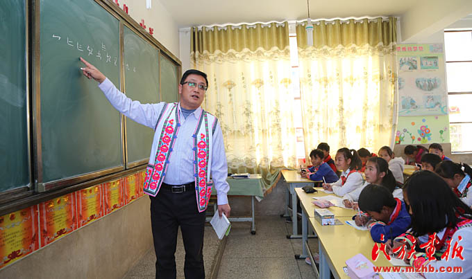 走進(jìn)干凈整潔的教學(xué)樓,陣陣讀書聲漸漸清晰,原來是六年級的學(xué)生正在上彝語課。看著認(rèn)真授課的彝族老師,校長杞萬開說:“建設(shè)德高業(yè)精的雙語教師團(tuán)隊(duì)是我們做好雙語教育的根本保證,因此我們每年都選派優(yōu)秀教師參加云南省的雙語教師培訓(xùn),提升教師‘彝語為輔,漢語普通話為主’的雙語教育能力。”