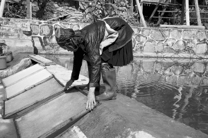 占里村共有182戶827人,這里的侗族古法造紙術(shù)源遠(yuǎn)流長,全村從事造紙業(yè)的就有170戶,占總戶數(shù)的93%。這里的造紙業(yè)依然保留著原始的家庭作坊和世代傳承的手工制作方式。這種古法造紙技藝以構(gòu)樹皮為原材料,添加獼猴桃藤、野棉花根,經(jīng)過水浸泡、石灰腌制、蒸煮、碓爛、攤曬、燒堿漂白、打漿、瀝水、抄紙、烤干等72道工序,最終制成白皮紙。