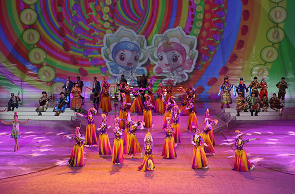 2016年1月20日,為期11天的第十三屆全國冬季運動會在烏魯木齊冰上運動中心速滑館拉開大幕。開幕式由體育儀式、文體表演和點燃主火炬塔三個部分組成。在文體表演章節(jié),承擔本次開幕式文體表演與伴舞任務的新疆藝術學院200名學生與來自新疆各民族的文藝工作者一起,為觀眾獻上了一臺精心策劃和編排、以“冰雪天山陽光絲路”為主題的精彩表演。參加開幕式文體表演的舞蹈系2014級、2015級學生,大部分是第一次參加國家級的大型活動,他們克服嚴寒,用自己的實際行動為精彩冬運會助力添彩