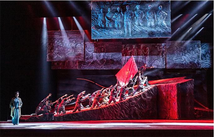 在舞蹈語言的設(shè)計上,編導(dǎo)融入當代元素,使觀眾不但感受到審美的親切與現(xiàn)代感,而且還自然地進入回望歷史的情境,對其思想內(nèi)涵的理解更為準確。該劇的道具使用和調(diào)度也頗為大氣,令人印象深刻。一組斜坡狀的大型舞臺道具不但由群眾演員直接移動而實現(xiàn)即時的場景調(diào)度,還可使演員上下和左右而行,最終組合成巨大的中國共產(chǎn)黨黨徽,輔助完成了人民英靈和英雄的形象塑造。