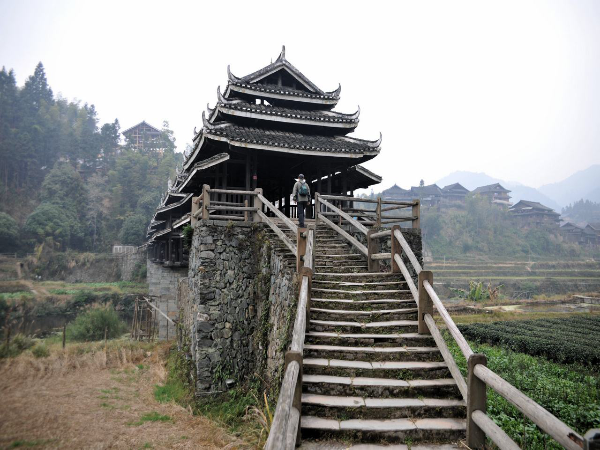 風(fēng)雨橋以石拱木作,廊、屋、亭、閣為一體,造型別致、美不勝收。無論是遠(yuǎn)眺還是進(jìn)觀,都體現(xiàn)出獨(dú)特的審美意境。鏈接廊橋與屋亭的是長條青石,橋與村寨的連接則用花石鋪路,橋面主體是當(dāng)?shù)厮寄静?。這種自然生態(tài)環(huán)保的理念,更彰顯了瑤族人民獨(dú)特的審美境界。