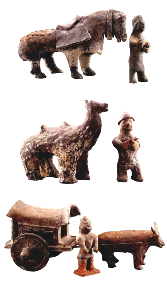墓葬形制方面,大學(xué)路北魏墓弧方形墓室結(jié)構(gòu),是在中原漢晉方形墓葬形制基礎(chǔ)上,融入了游牧民族圓形穹廬造型因素形成的新結(jié)構(gòu),并對其后的隋唐墓葬也產(chǎn)生了一定影響。隨葬陶器中,根據(jù)陶俑的衣著及相貌,可分辨出既有漢人、鮮卑人形象,可能還有西域胡人形象,體現(xiàn)出當(dāng)時各族人群共同生活的場景;家禽及牲畜等動物形象中,中原定居民族喜見豢養(yǎng)的雞、犬、豬等禽畜類與游牧民族賴以生存的羊、馬、牛及駱駝等牲畜類動物共處的現(xiàn)象,體現(xiàn)了農(nóng)耕和游牧凝于一體的生產(chǎn)生活方式。雖然這座墓葬的墓主族屬身份已無法考辨,但墓葬所體現(xiàn)的民族融合、文化融匯的氣息十分強烈。