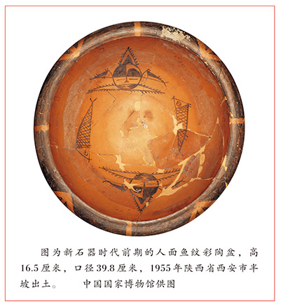 在中國(guó)國(guó)家博物館的展廳中,既有陜西半坡出土的人面魚紋彩陶盆、陜西華州區(qū)出土的鷹形陶鼎、河南賈湖出土的七孔骨笛、內(nèi)蒙古翁牛特旗出土的紅山玉龍、甘肅出土的馬家窯文化渦紋四系彩陶罐,也有山西襄汾陶寺出土的陶壺、浙江良渚出土的雙鼻陶壺、四川廣漢三星堆出土的青銅面具……