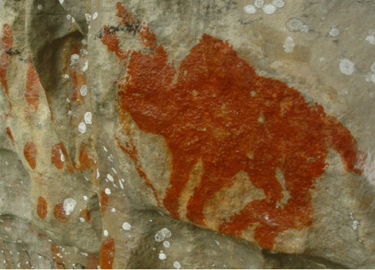 巖畫在石壁低部內(nèi)凹,可避雨,并有四處洞穴,依次下降,位置較高者為一出水洞,四季有水,其它洞穴開口小,內(nèi)部較寬、干燥,洞口處對應(yīng)石壁項部有明顯煙熏遺跡,似人為造成。