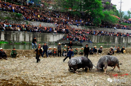 ▲ 斗牛之牛,都是專門精心飼養(yǎng)的,不從事耕地、拉車、推磨等勞作,均為雄性水牛,分為寬角、窄角兩個級別。斗牛賽制,先為淘汰賽,決斗時改為單循環(huán)賽,最后勝出者為年度牛王。斗牛場面十分慘烈,動人心魄,觀眾少則數(shù)百,多則數(shù)萬。