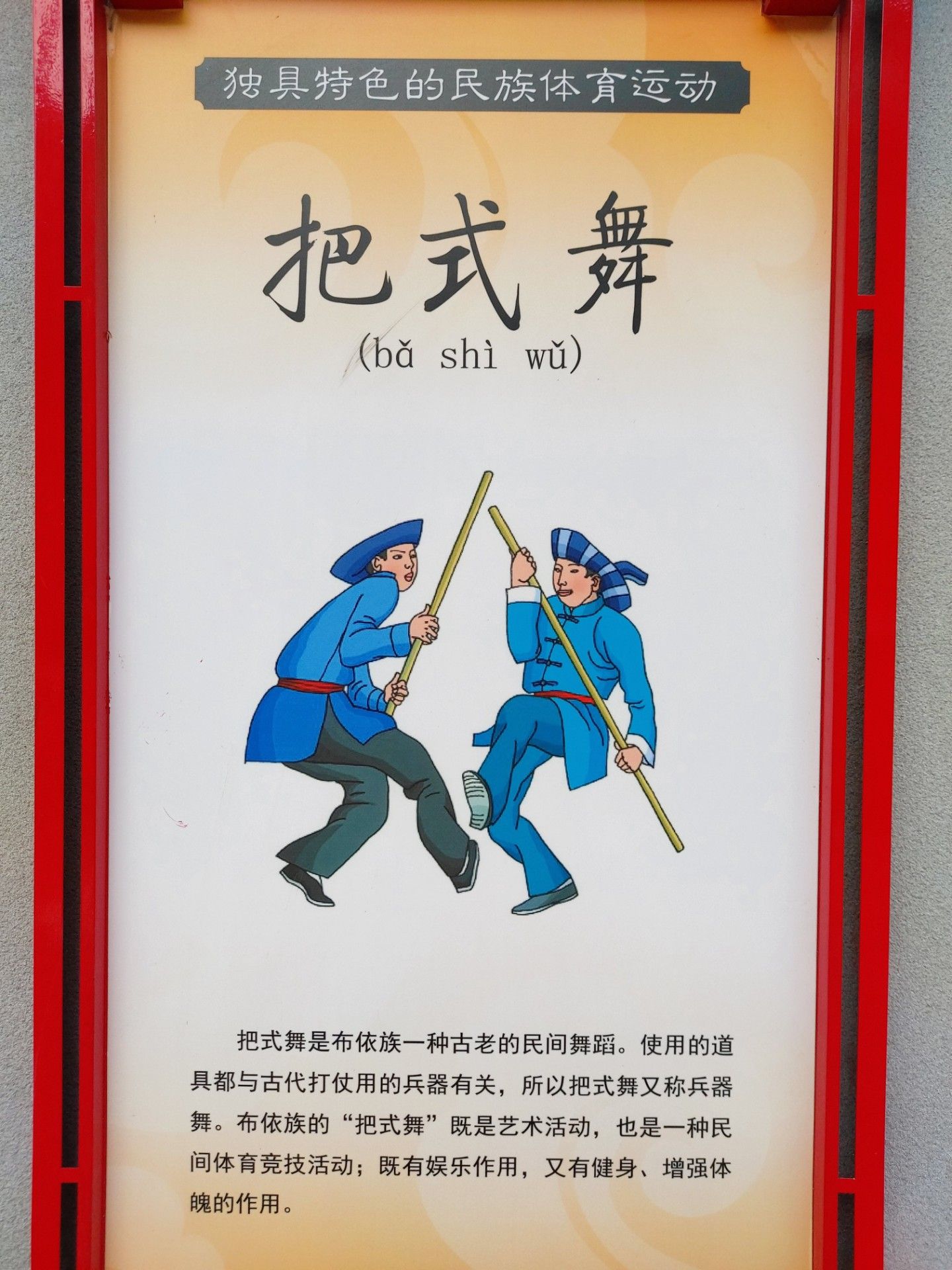 把式舞是布依族一種古老的民間舞蹈。使用的道具都與古代打仗用的兵器有關(guān),所以把式舞又稱兵器舞。布依族的“把式舞”既是藝術(shù)活動(dòng),也是一種民間體育競(jìng)技活動(dòng);既有娛樂(lè)作用,又有健身、增強(qiáng)體魄的作用。