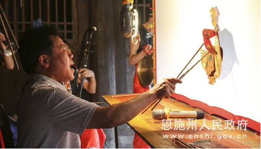 2018年6月10日,省非物質文化遺產鶴峰滿堂音傳承人彭文照正在表演滿堂音皮影戲。