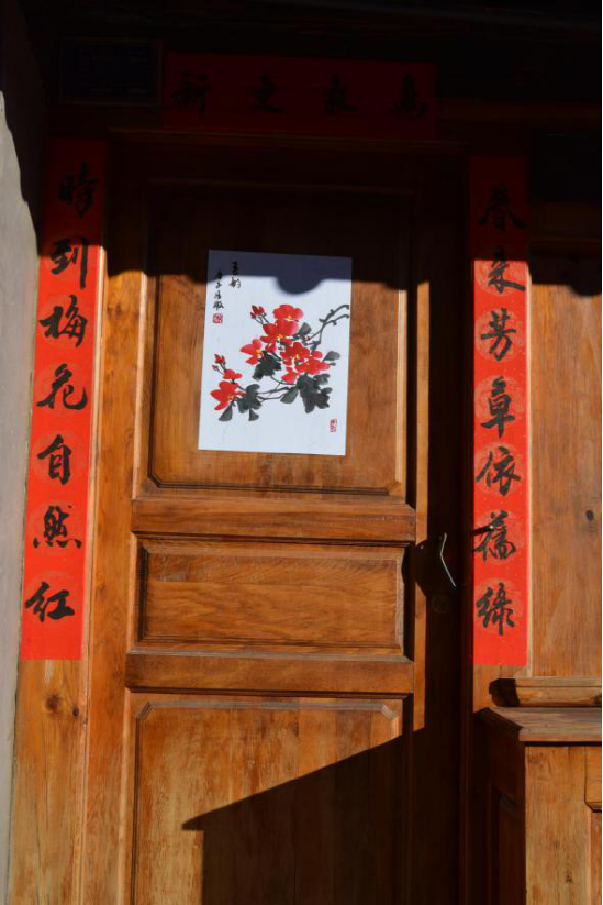 寫春聯繪年畫的傳統(tǒng)在劍川縣金華鎮(zhèn)由來已久,明朝洪武年間改土歸流和移民屯邊制度的推行,使儒家文化、理學思想逐漸融入邊疆人民的生活。金華古鎮(zhèn)居民受此影響,走上追求仕途功名的道路,文人鄉(xiāng)紳都以顯示儒學身份為榮。每逢春節(jié),人們會邀請有功名的仕子或傳學明經的文人來到家中,撰寫對聯,同時根據時令畫上一兩幅門神畫,希望通過此舉祈愿自家后生求得功名。如今走在金華古鎮(zhèn)西門街上,仍能看到家家種花養(yǎng)草,戶戶楹聯盈門,一派文風蔚然的生機。
